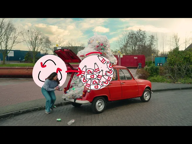 Voor de awarenesslaag maakten we een opvallende video waarin afvalgedrag liefdevol werd uitvergroot: een auto zó vol statiegeldflessen dat de achterklep openspat. Humor als haakje, met een heldere boodschap: als je er toch bent, lever het dan goed in. Met de bulkmachine kan dat nu extra makkelijk.